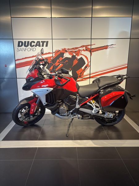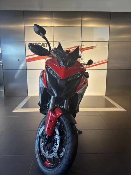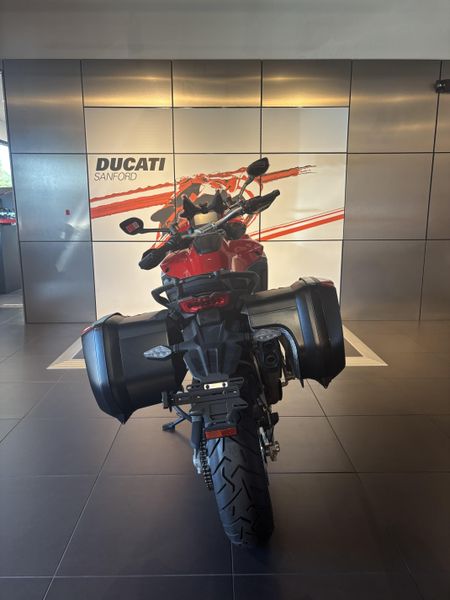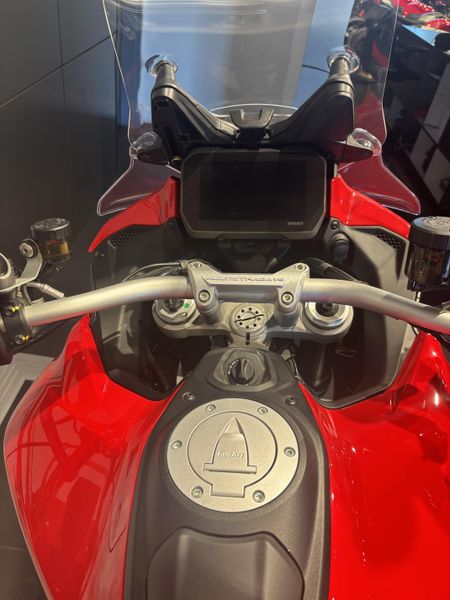 • Standard Equipment: Ducati Skyhook Suspension, Minimum preload, Ducati Quick Shift, Cruise control, Hands-free, Backlit handlebar switches, 6.5" TFT colour display with Ducati Connect and full-map navigation system, Full LED headlight, Tire pressure monitoring system (TPMS), Hands-free fuel tank cap, Auxiliary LED lights, Heated rider seat, Heated passenger seat, Heated handgrips, Central stand, Plastic side panniers